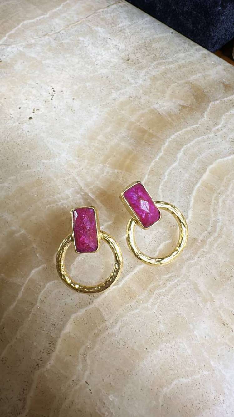 Bronz üzerine altın kaplama, el yapımı, yakut küpe