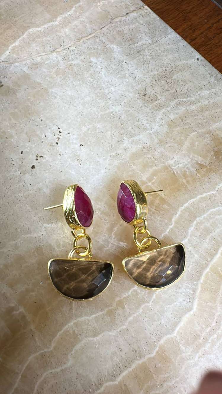 Bronz üzerine altın kaplama, el yapımı, yakut kuvars küpe