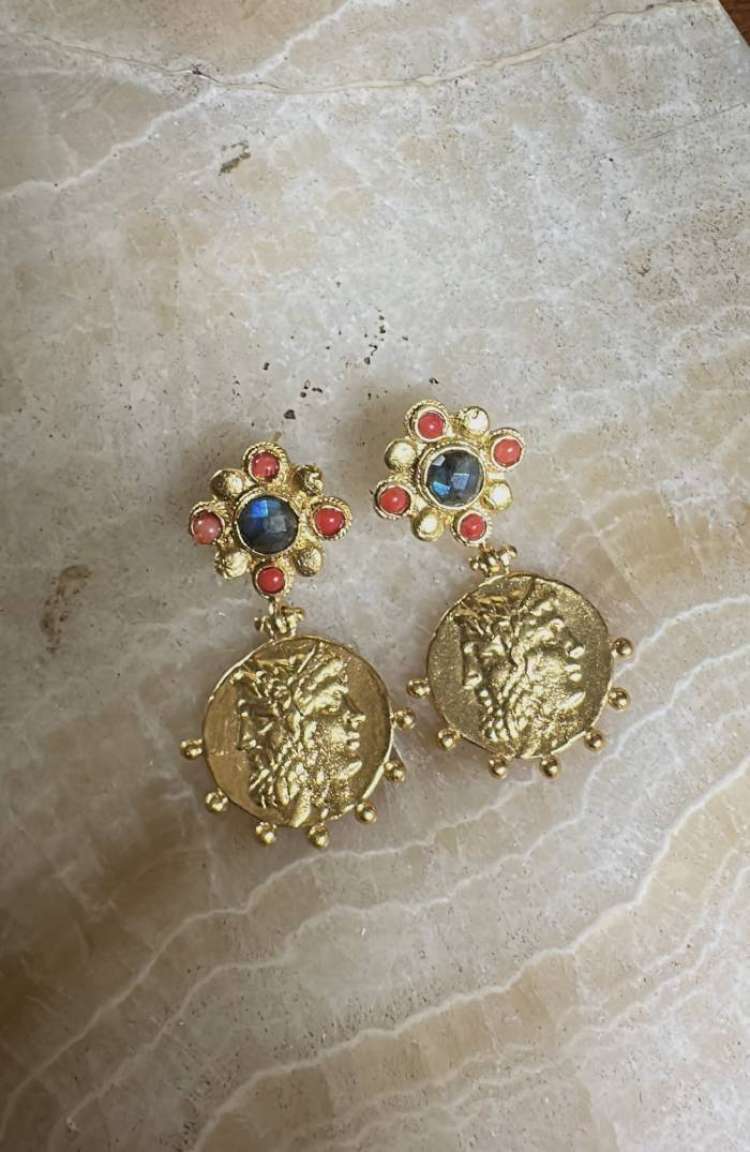 Bronz üzerine altın kaplama, el yapımı, mercan, labradorit küpe