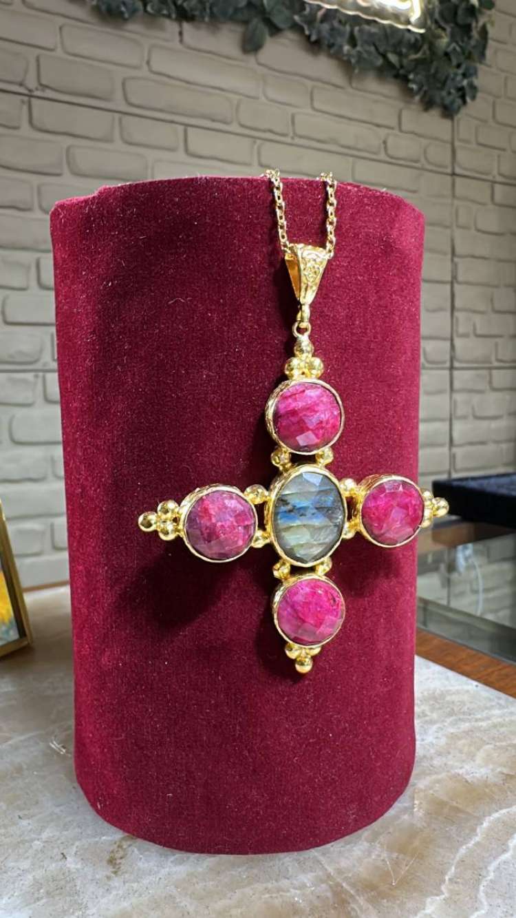 Bronz üzerine altın kaplama, el yapımı, labradorit yakut kolye