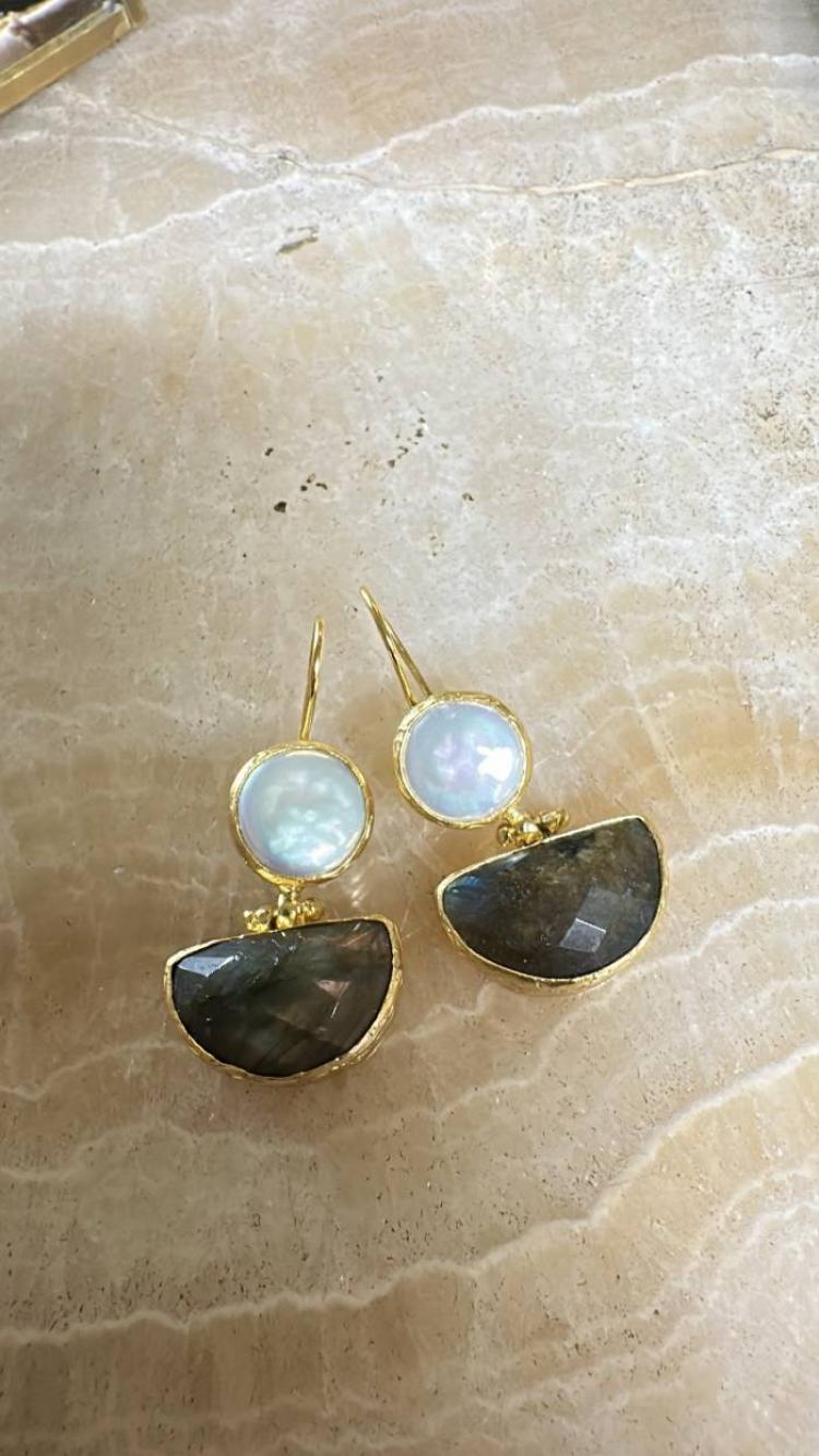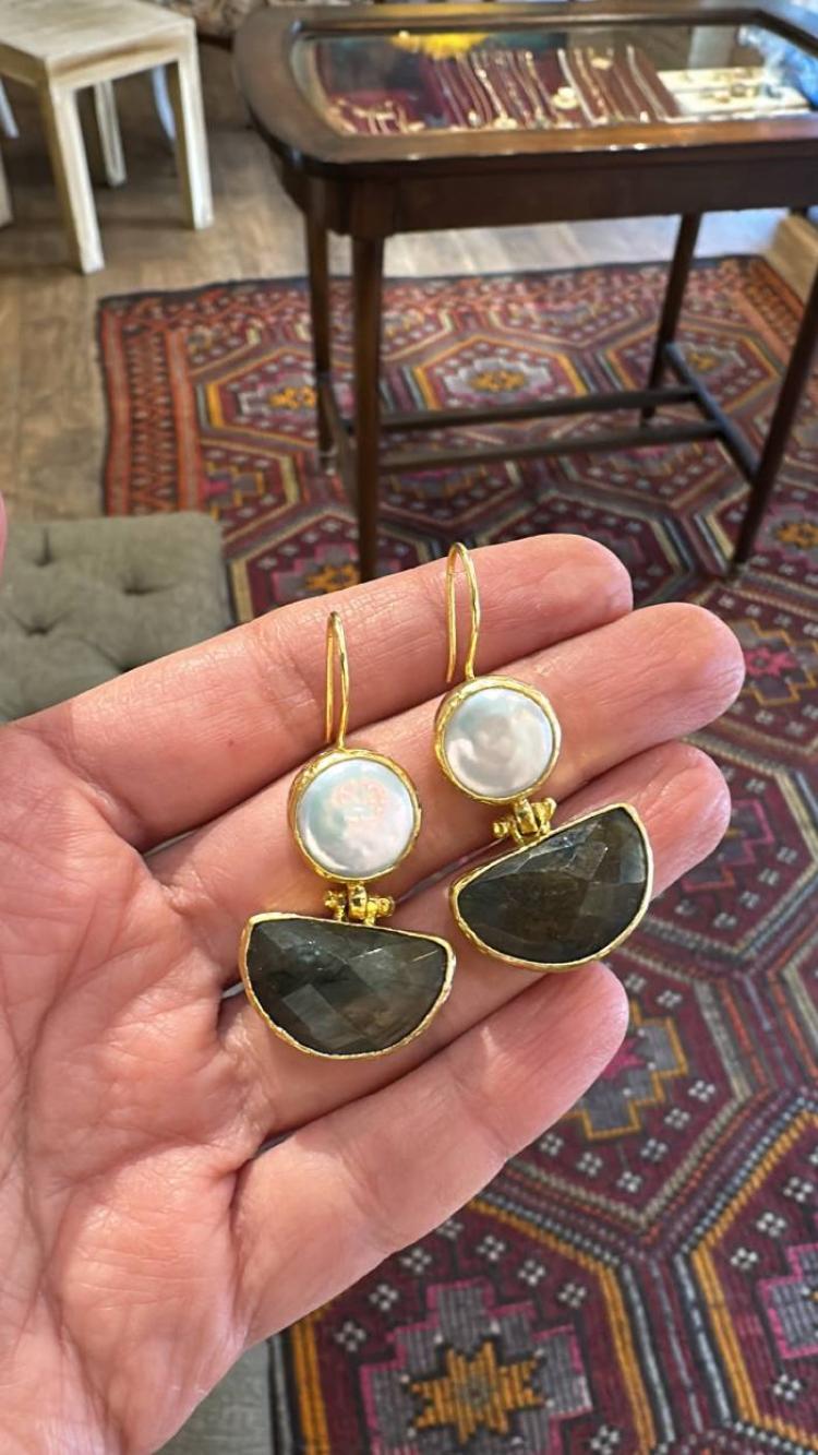 Bronz üzerine altın kaplama, el yapımı, barok inci ve labradorit küpe