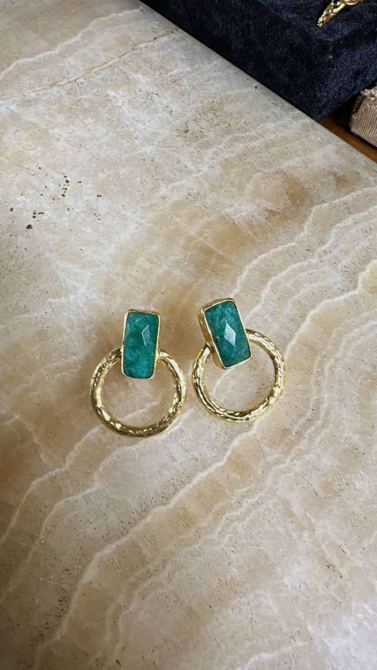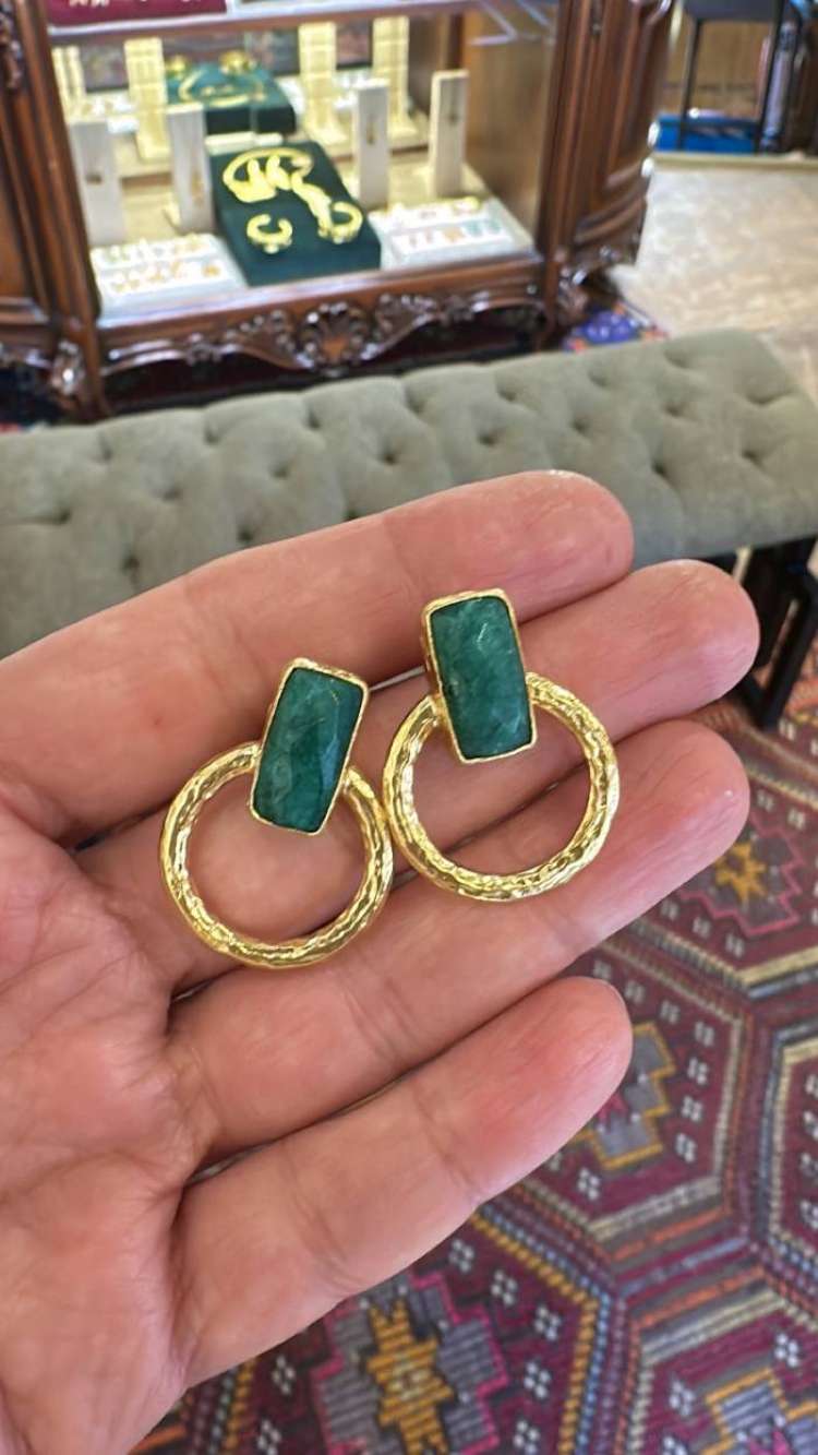 Bronz üzerine altın kaplama, el yapımı, zümrüt küpe