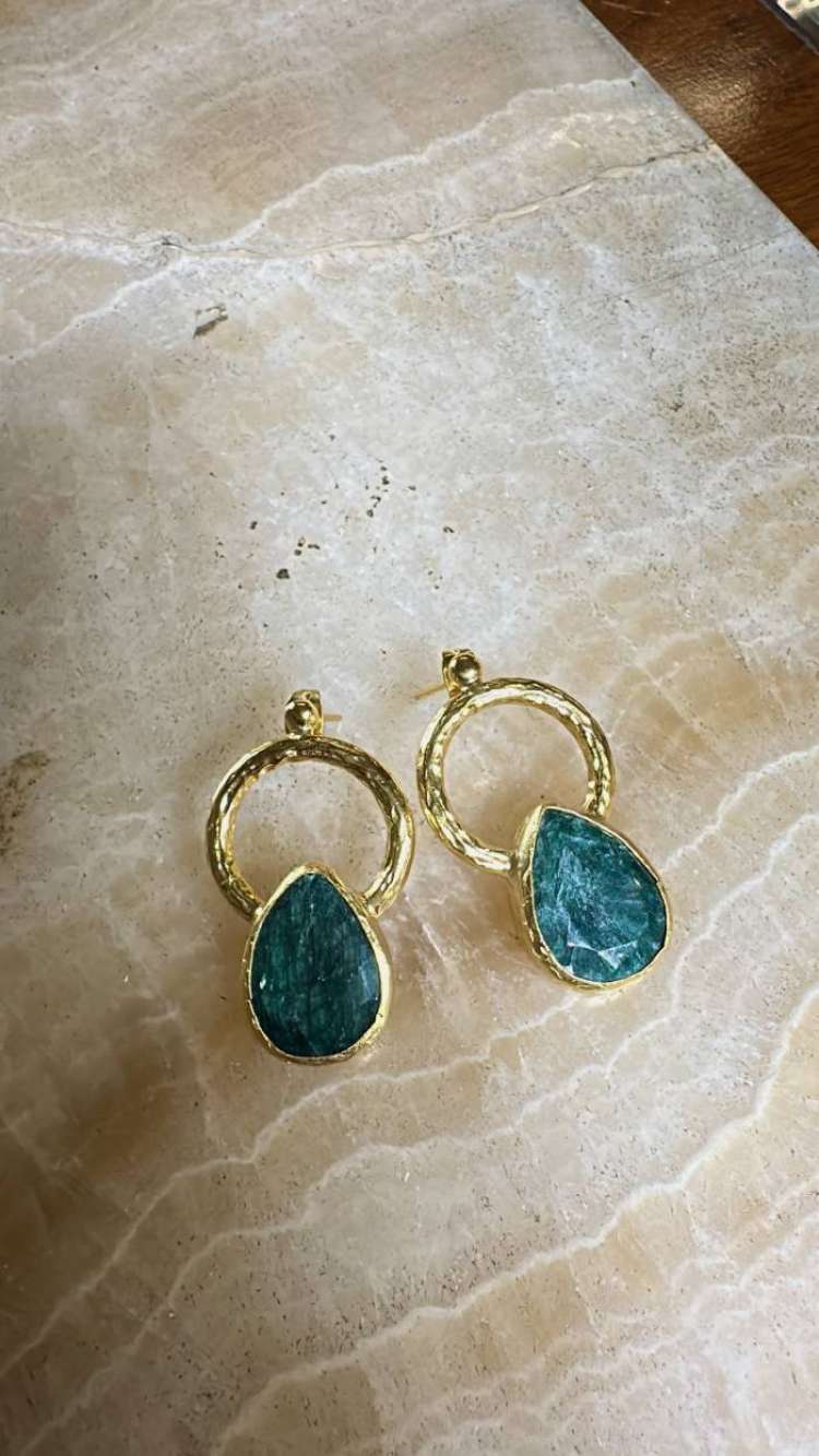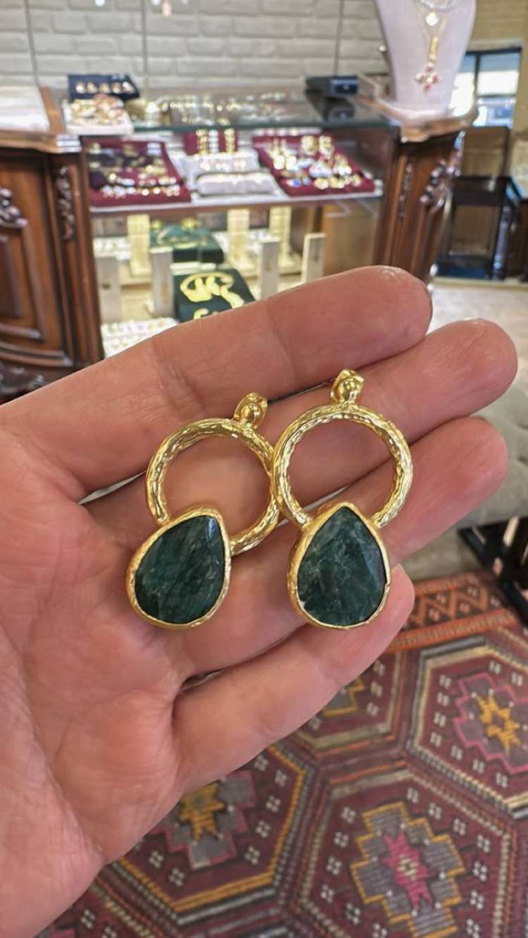 Bronz üzerine altın kaplama, el yapımı, zümrüt küpe