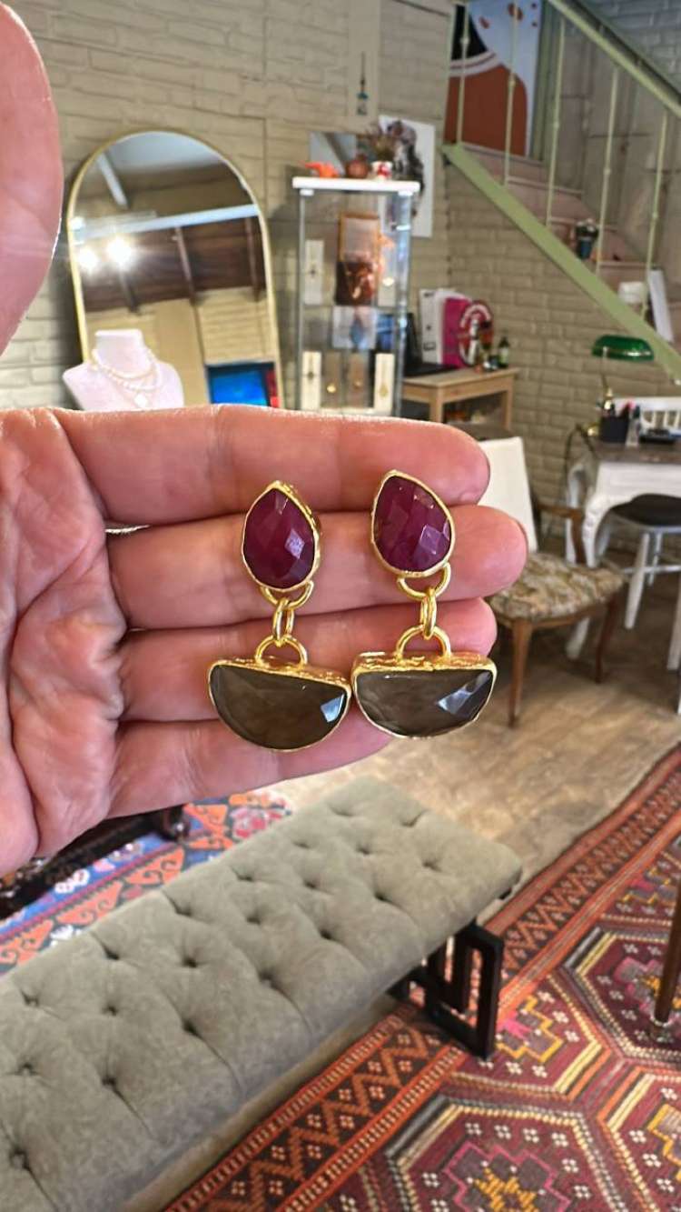 Bronz üzerine altın kaplama, el yapımı, yakut kuvars küpe