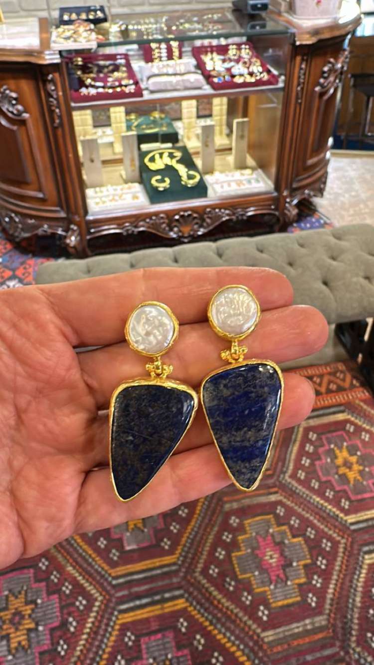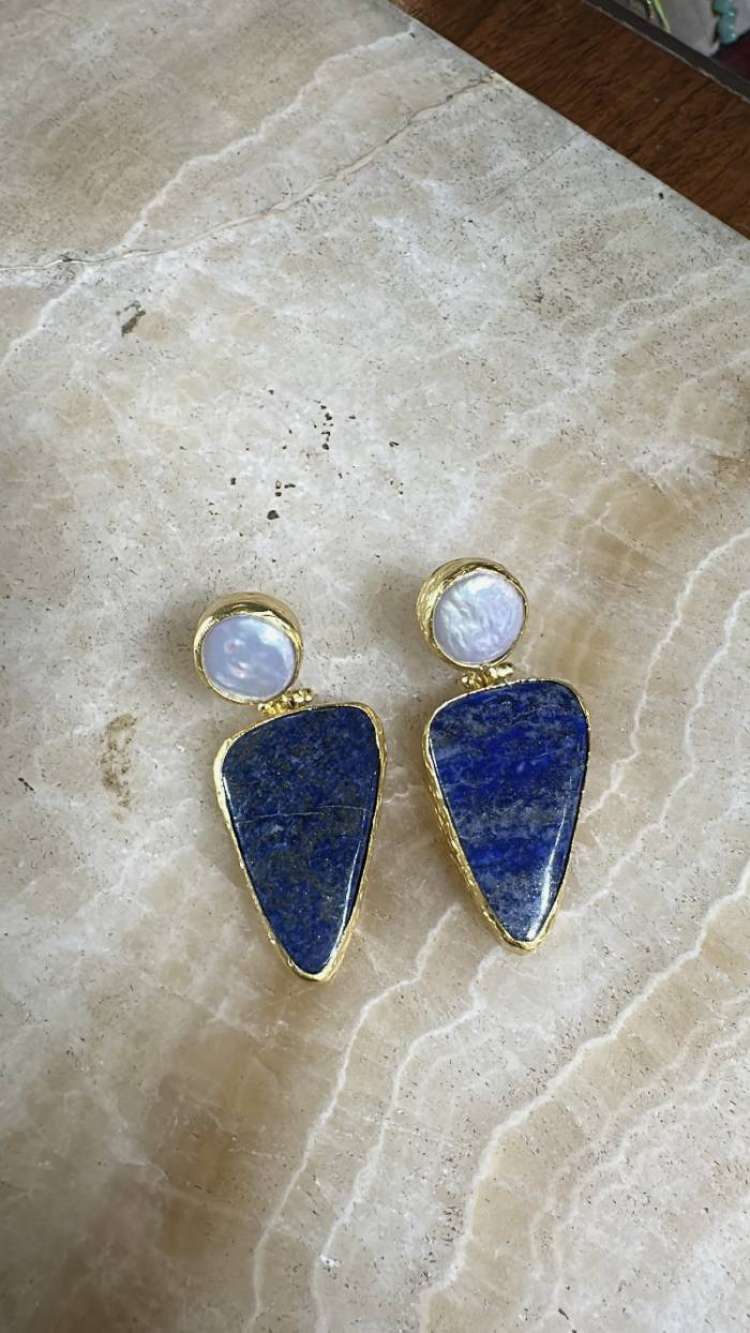 Beonz üzerine altın kaplama, el yapımı, barok inci, lapis lazuli küpe