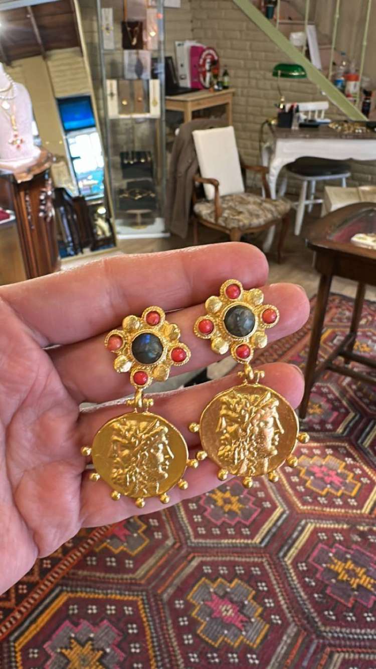 Bronz üzerine altın kaplama, el yapımı, mercan, labradorit küpe