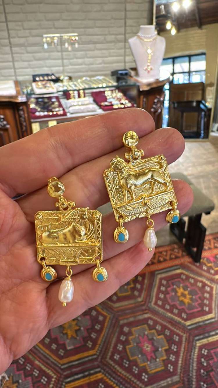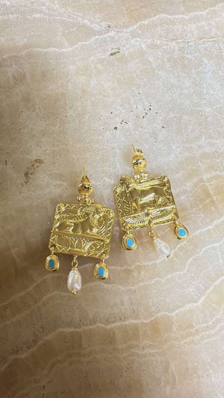 Bronz üzerine altın kaplama, el yapımı, soğuk mine ve inci küpe