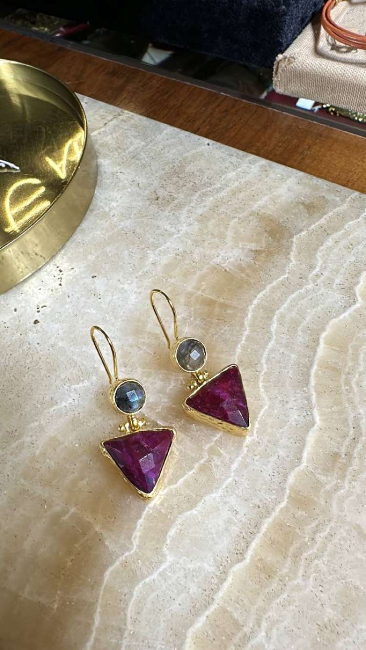 Bronz üzerine altın kaplama, el yapımı, labradorit, yakut küpe