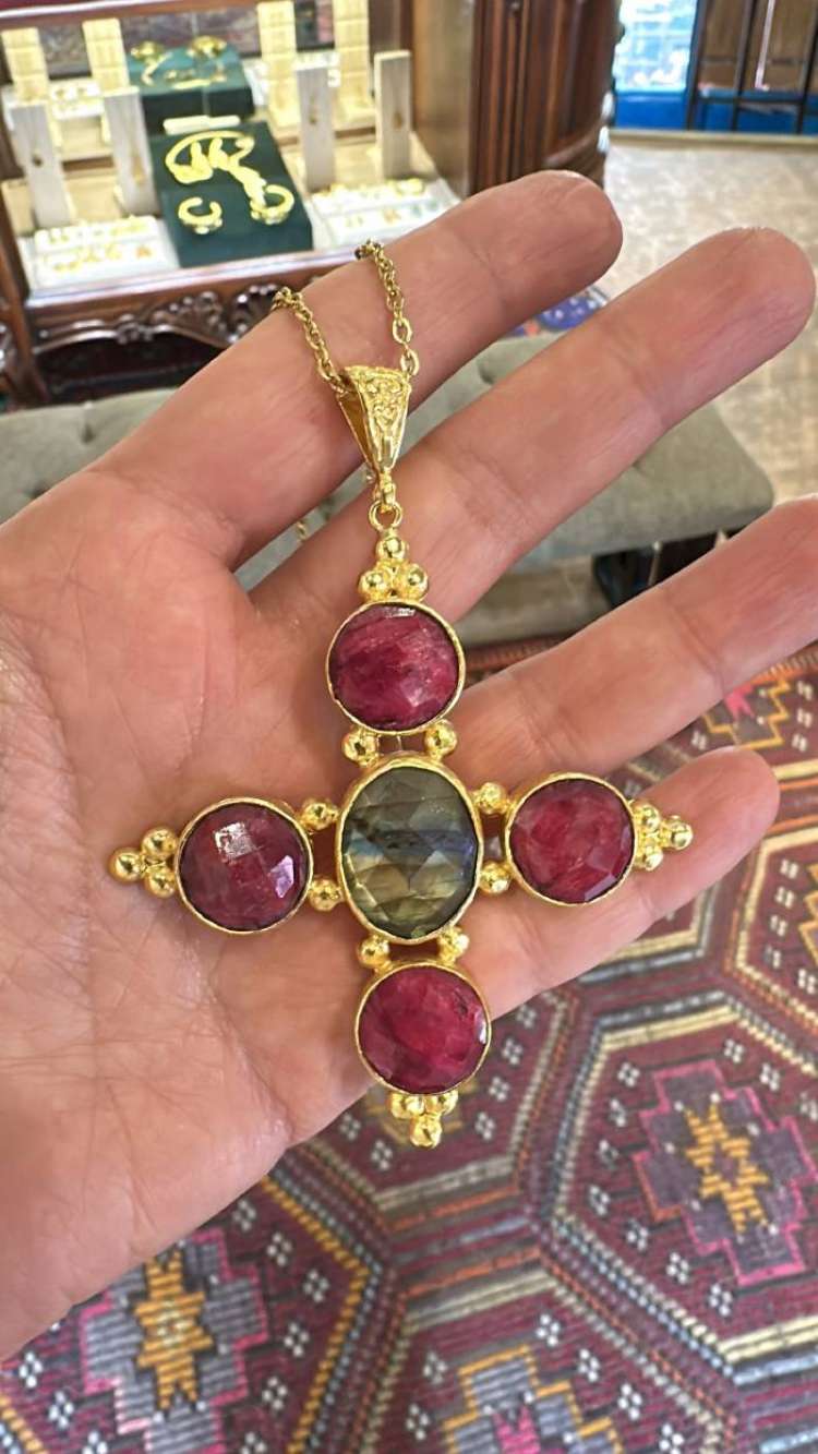 Bronz üzerine altın kaplama, el yapımı, labradorit yakut kolye